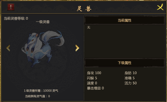 1、「灵兽系统」开启条件:元气值满1620。
