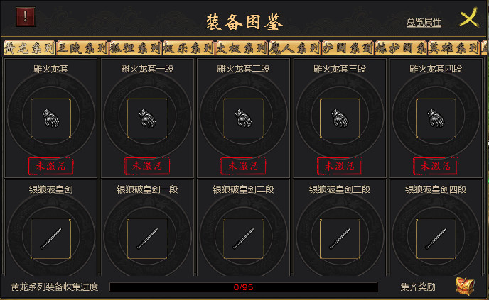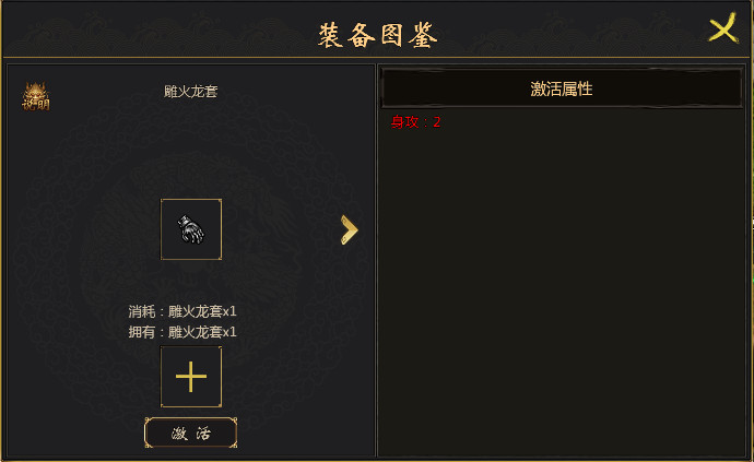 ①点击图鉴内的任一未激活的装备将进入激活页面,放入对应装备将激活一定的属性值;