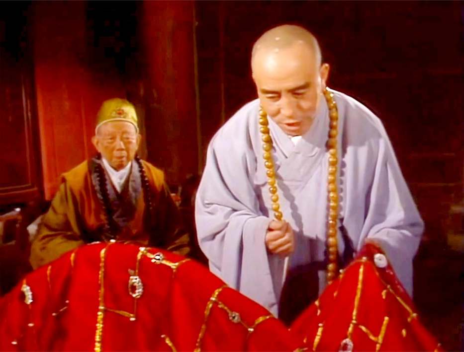 玄奘法师经历千难万险,到达灵山面见如来求取真经。如来命迦叶、阿难二位尊者传授经书。二位尊者趁机向玄奘师徒索要“人事”。